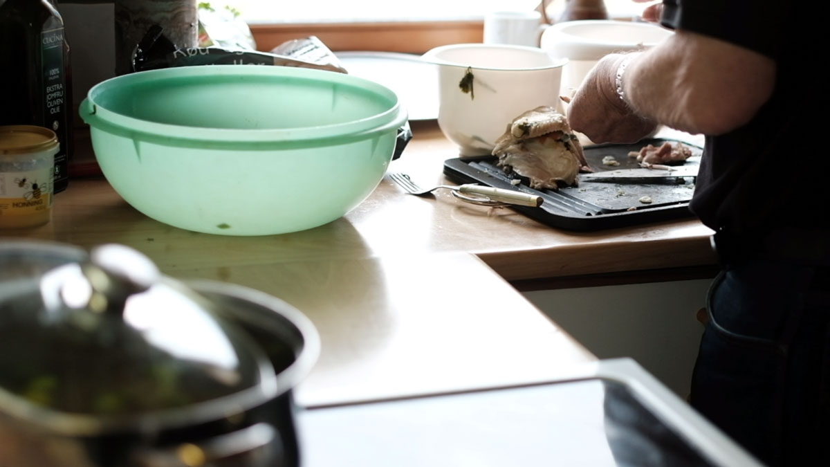 Dinner making is a communal activity with the Jensens, from Copenhagen to Nordjylland. It’s very hyggelig indeed, and lovely to be a part of. As this house is ridiculously photogenic, heavenly light pouring in from all angles, no matter the weather – I decided to film Flemming’s dad making this magic broth (yes, with my new graphite wonder).