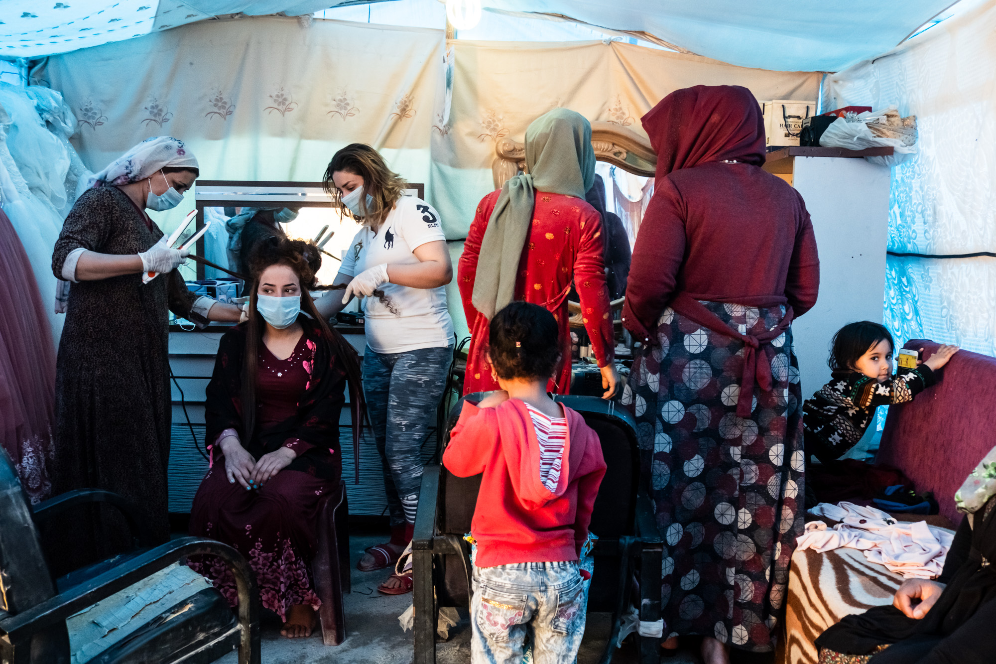 Buthena (center, in the white tshirt) straightens the hair of a bride in her new salon with her mother, while another customer gets her makeup done. The salon is a space for women to gather, chat and care for themselves. Photo by Charlene Winfred/Preemptive Love